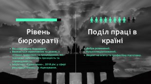 Рівень бюрократіїВисокий рівень бюрократії. Вважається ефективною та дієвою, з чіткими правилами та процедурами, які покликані забезпечити прозорість та справедливість.Ініціатива «Єдине вікно», 2018 рік: у сфері реєстрації бізнесу та ліцензування. Поділ праці в країніДобре розвинений. Вузькоспеціалізований. Акцент на освіту та професійну підготовку.