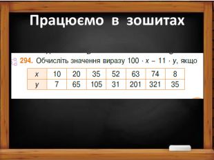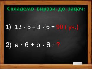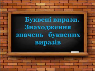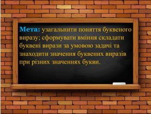 Мета: узагальнити поняття буквеного виразу; сформувати вміння складати буквені вирази за умовою задачі та знаходити значення буквених виразів при різних значеннях букви.