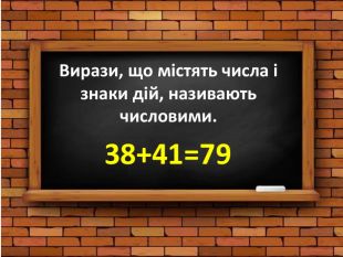 Вирази, що містять числа і знаки дій, називають числовими.38+41=79