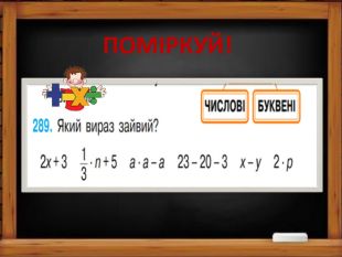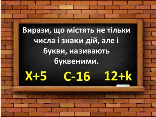 Вирази, що містять не тільки числа і знаки дій, але і букви, називають буквеними. Х+5 С-1612+k