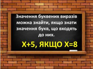 Значення буквених виразів можна знайти, якщо знати значення букв, що входять до них. Х+5, ЯКЩО Х=8