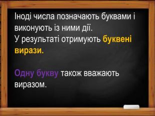 Іноді числа позначають буквами і виконують із ними дії. У результаті отримують буквені вирази. Одну букву також вважають виразом.