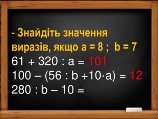 - Знайдіть значення виразів, якщо a = 8 ; b = 761 + 320 : a = 101100 – (56 : b +10·a) =280 : b – 10 =