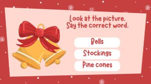 Look at the picture. Say the correct word. Bells. Stockings. Pine cones