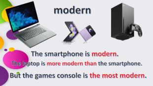 modern. The smartphone is modern. The laptop is more modern than the smartphone. But the games console is the most modern.