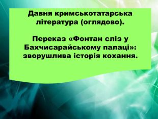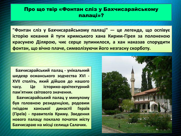 "Фонтан сліз у Бахчисарайському палаці" — це легенда, що оспівує історію кохання й туги кримського хана Кирим-Гірея за полоненою красунею Ділярою, чиє серце зупинилося, а хан наказав спорудити фонтан, що вічно плаче, символізуючи його незгасну скорботу. Про що твір «Фонтан сліз у Бахчисарайському палаці»? Бахчисарайський палац - унікальний шедевр османського зодчества XVI - XVII століть, який дійшов до нашого часу. Це історико-архітектурний пам'ятник світового значення. Бахчисарайський палац у минулому був головною резиденцією, родовим гніздом ханської династії Гераїв (Гіреїв) - правителів Криму. Зведення нового палацу поклало початок місту Бахчисараю на місці селища Салачик.