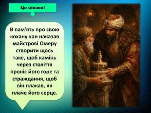 Подумайте!1. Чому смерть Деляре так глибоко вразила хана?2. Як у творі показано заздрість і жорстокість?3. Чому фонтан називають «фонтаном сліз»?4. Що символізують краплі води у фонтані?5. Як образ фонтану передає почуття хана?6. Як ви оцінюєте поведінку хана після трагедії?7. Яку роль у творі відіграє майстер Омер?8. Чого навчає ця легенда сучасного читача?