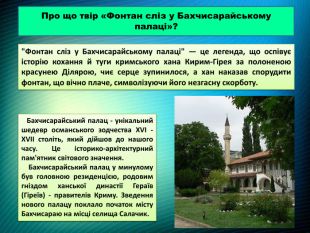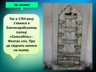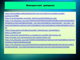 https://hromadske.radio/podcasts/tse-pro-nas-kulturna-mozaika-narodiv-pivdnia/1227085https://ua.dorogovkaz.com/stati_bahchisaraiskij%20dvorec.phphttps://uk.wikipedia.org/wiki/%D0%A4%D0%B0%D0%B9%D0%BB:%D0%A4%D0%BE%D0%BD%D1%82%D0%B0%D0%BD_%D1%81%D0%BB%D1%96%D0%B7_%D1%83_%D0%91%D0%B0%D1%85%D1%87%D0%B8%D1%81%D0%B0%D1%80%D0%B0%D1%97. JPGhttps://www.pslava.info/Baxchysaraj. M_Palac. Xanskyj_Djurbe. Diljary-bikech,133062.htmlhttps://ctrcenter.org/uk/shho-vy-znayete-pro-selsebil-abo-fontan-slizhttps://oringo.com.ua/novosti/za-kim-plache-fontan-slizhttps://uk.wikipedia.org/wiki/%D0%91%D0%B0%D1%85%D1%87%D0%B8%D1%81%D0%B0%D1%80%D0%B0%D0%B9https://uk.wikipedia.org/wiki/%D0%9 A%D1%80%D0%B8%D0%BC%D1%81%D1%8 C%D0%BA%D0%B5_%D1%85%D0%B0%D0%BD%D1%81%D1%82%D0%B2%D0%BEВикористані джерела