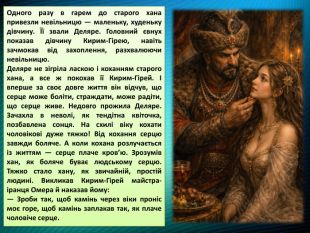 Одного разу в гарем до старого хана привезли невільницю — маленьку, худеньку дівчину. Її звали Деляре. Головний євнух показав дівчину Кирим-Гірею, навіть зачмокав від захоплення, разхвалюючи невільницю. Деляре не зігріла ласкою і коханням старого хана, а все ж покохав її Кирим-Гірей. І вперше за своє довге життя він відчув, що серце може боліти, страждати, може радіти, що серце живе. Недовго прожила Деляре. Зачахла в неволі, як тендітна квіточка, позбавлена сонця. На схилі віку кохати чоловікові дуже тяжко! Від кохання серцю завжди боляче. А коли кохана розлучається із життям — серце плаче кров’ю. Зрозумів хан, як боляче буває людському серцю. Тяжко стало хану, як звичайній, простій людині. Викликав Кирим-Гірей майстра-іранця Омера й наказав йому: — Зроби так, щоб камінь через віки проніс моє горе, щоб камінь заплакав так, як плаче чоловіче серце.