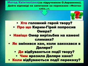 Метод Квінтиліана(за підручником О. Авраменка). Дайте відповіді на запитання за переказом «Фонтан сліз…».• Хто головний герой твору? • Про що Кирим-Гірей попросив Омера?• Навіщо Омер вирізьбив на камені слимака? • Як змінився хан, коли закохався в Деляре? • Де відбуваються події твору?• Чим вразила Деляре хана?• Коли відбуваються події переказу?