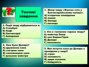 Тестові завдання. Жанр твору «Фонтан сліз у Бахчисарайському палаці»: А) історичне оповідання. Б) поема. В) балада. Г) легенда2. Події твору відбуваються в: А) СтамбуліБ) КафіВ) БахчисараїГ) Аккермані3. Хто є головним героєм твору?А) майстер Омер. Б) хан Кирим-Гірей. В) Деляре. Г) полонянка. Ким була Деляре?А) дружиною хана. Б) сестрою хана. В) наложницею хана. Г) донькою майстра5. Яке почуття хана до Деляре є провідним у творі?А) страх. Б) ненависть. В) щире кохання. Г) байдужість
