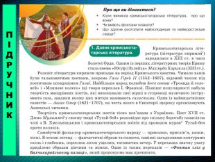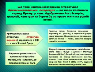 Кримськотатарська література (література киримли) зародилася в ХІІI ст. в часи Золотої Орди. Що таке кримськотатарська література?Кримськотатарська література — це твори корінного народу Криму, у яких відображено його історію, традиції, культуру та боротьбу за право жити на рідній землі. Кримські татари (історична самоназва — киримли), як і українці, є корінним народом нашої держави. Він сформувався як нащадок багатьох етносів — таврів, сарматів, хозарів, печенігів, половців. Киримли розмовляють кримськотатарською мовою, яка належить до тюркської мовної сім’ї. Одним із перших літературних творів Криму стала поема «Юсуф і Зулейха» Махмуда Киримли (ХІІІ ст.). Розквіт літератури киримли припадає на період Кримського ханства. Чимало ханів були талановитими поетами, зокрема Гази Гірей ІІ (1552–1607), відомий також під поетичним псевдонімом Газаї.