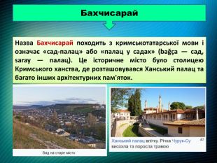 Бахчисарай Походження назви: поєднання слів "сад" (bağça) та "палац" (saray).Історичне значення: колишня столиця Кримського ханства (1532-1783). Основні пам'ятки: Ханський палац, Успенський монастир, печерне місто Чуфут-Кале. Символ: місто відоме своїми садами, фонтанами та архітектурою, що відображають кримськотатарську культуру.