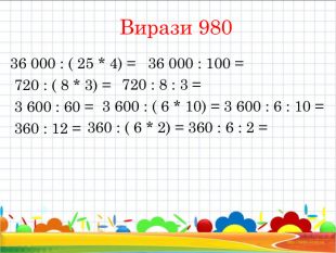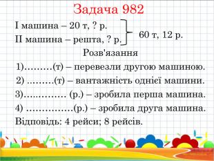 Задача 982 І машина – 20 т, ? р. ІІ машина – решта, ? р. Розв'язання 1)………(т) – перевезли другою машиною. 2) ..…….(т) – вантажність однієї машини. 3)…..……… (р.) – зробила перша машина. 4) ……………(р.) – зробила друга машина. Відповідь: 4 рейси; 8 рейсів. 60 т, 12 р.
