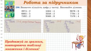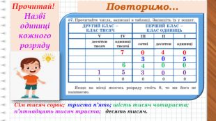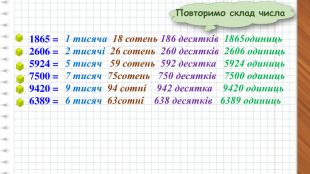 1 тисяча 18 сотень 186 десятків 1865одиниць2 тисячі 26 сотень 260 десятків 2606 одиниць5 тисяч 59 сотень 592 десятка 5924 одиниць7 тисяч 75сотень 750 десятків 7500 одиниць9 тисяч 94 сотні 942 десятка 9420 одиниць6 тисяч 63сотні 638 десятків 6389 одиниць1865 =2606 =5924 =7500 = 9420 =6389 =Повторимо склад числа