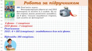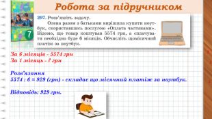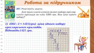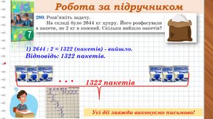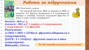 Робота за підручником. Бананів - 2685 кг. Ананасів - 2691 кг ?, порівну в 4 супермаркети1 супермаркет - ? кг фруктів Розв’язання1) 2685 + 2691 = 5376(кг)- фруктів відправили в супермаркети,2)5376 : 4 = 1344(кг) - фруктів завезли в один супермаркет. Відповідь: 1344 кг. Усі дії завжди виконуємо письмово!