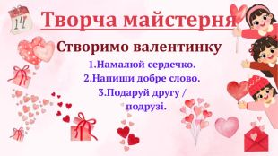 Творча майстерня. Створимо валентинку. Намалюй сердечко. Напиши добре слово. Подаруй другу / подрузі.