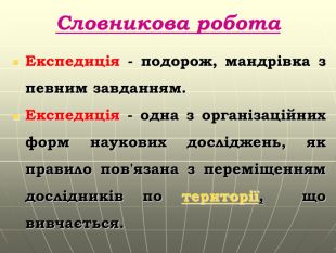 Словникова робота. Експедиція - подорож, мандрівка з певним завданням. Експедиція - одна з організаційних форм наукових досліджень, як правило пов'язана з переміщенням дослідників по території, що вивчається.