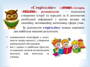 В даній роботі висвітлено питання однієї з технологій, сторітелінг, яку можна використовувати під час планування виховних і навчальних завдань класними керівниками початкових класів.