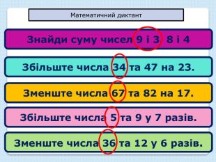 Знайди суму чисел 9 і 3, 8 і 4 Збільште числа 34 та 47 на 23. Зменште числа 67 та 82 на 17. Збільште числа 5 та 9 у 7 разів. Зменште числа 36 та 12 у 6 разів. Математичний диктант