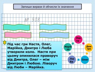 (( ) )Під час гри Настя, Олег, Марійка, Дмитро і Люба утворили коло. Настя при цьому опинилася праворуч від Дмитра, Олег – між Дмитром і Любою. Ліворуч від Люби – Марійка. Настя. Марійка. Люба. Олег. Запиши вирази й обчисли їх значення