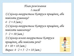 План розв'язанняІ спосіб1) Скільки використала Катруся прищіпок, аби повісити рушники?4 ∙ 2 = 8 (шт.) 2) Скільки використала Катруся прищіпок, аби повісити наволочки?5 ∙ 2 = 10 (шт.)3) Скільки всього використала Катруся прищіпок, аби повісити речі?8 + 10 = 18 (шт.)Вираз: 4 ∙ 2 + 5 ∙ 2 = 18 (шт.)