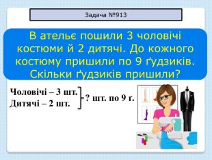 В ательє пошили 3 чоловічі костюми й 2 дитячі. До кожного костюму пришили по 9 ґудзиків. Скільки ґудзиків пришили? Чоловічі – 3 шт. Дитячі – 2 шт.? шт. по 9 ґ. Задача №913
