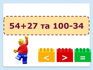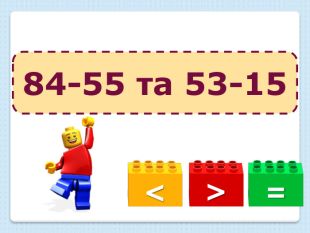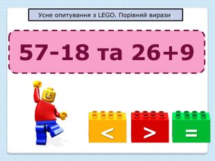 Усне опитування з LEGO. Порівняй вирази.=<>57-18 та 26+9