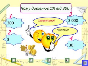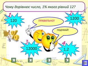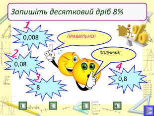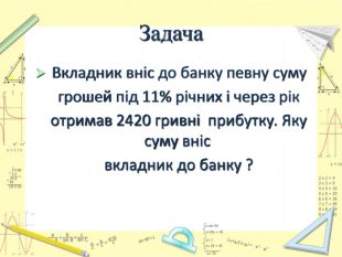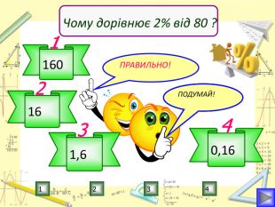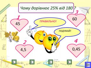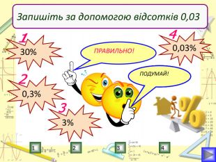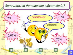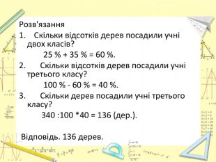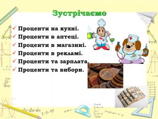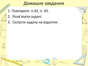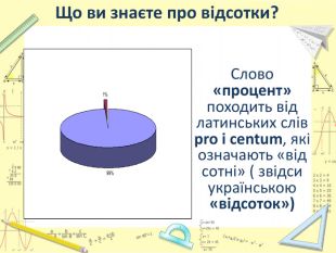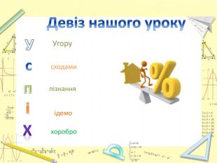 Мета уроку:визначити ступінь опанування теоретичного матеріалу, практичних умінь;навчитись використовувати набуті знання в стандартних і нестандартних ситуаціях;розкрити об’єктивну необхідність вивчення відсотків;вчимось цінувати : час, думку та працю товариша, активність, логічне мислення, самостійність, прагнення до успіху.