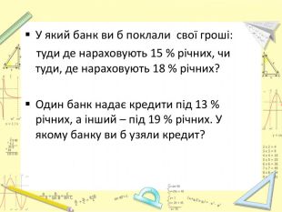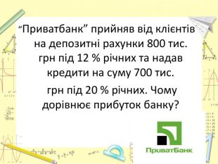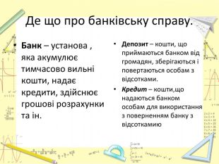 Де що про банківську справу. Банк – установа , яка акумулює тимчасово вильні кошти, надає кредити, здійснює грошові розрахунки та ін. Депозит – кошти, що приймаються банком від громадян, зберігаються і повертаються особам з відсотками. Кредит – кошти,що надаються банком особам для використання з поверненням банку з відсоткамию