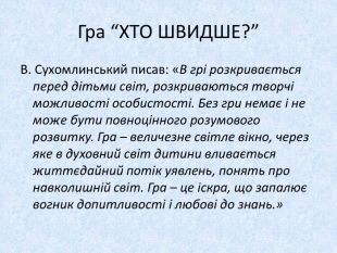 Гра “ХТО ШВИДШЕ?”В. Сухомлинський писав: «В грі розкривається перед дітьми світ, розкриваються творчі можливості особистості. Без гри немає і не може бути повноцінного розумового розвитку. Гра – величезне світле вікно, через яке в духовний світ дитини вливається життєдайний потік уявлень, понять про навколишній світ. Гра – це іскра, що запалює вогник допитливості і любові до знань.»