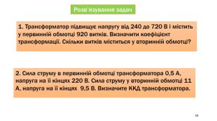 13 Розв’язування задач1. Трансформатор підвищує напругу від 240 до 720 В і містить у первинній обмотці 920 витків. Визначити коефіцієнт трансформації. Скільки витків міститься у вторинній обмотці?2. Сила струму в первинній обмотці трансформатора 0,5 А, напруга на її кінцях 220 В. Сила струму у вторинній обмотці 11 А, напруга на її кінцях 9,5 В. Визначите ККД трансформатора.