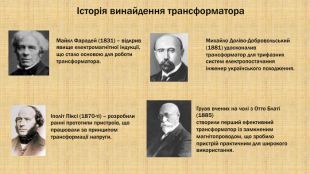 : Історія винайдення трансформатора. Майкл Фарадей (1831) – відкрив явище електромагнітної індукції, що стало основою для роботи трансформатора.Іполіт Піксі (1870-ті) – розробили ранні прототипи пристроїв, що працювали за принципом трансформації напруги. Михайло Доліво-Добровольський (1881) удосконалив трансформатор для трифазних систем електропостачання інженер українського походження. Груав вчених на чолі з Отто Блаті (1885)створили перший ефективний трансформатор із замкненим магнітопроводом, що зробило пристрій практичним для широкого використання.