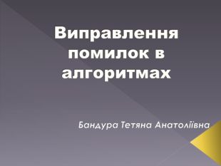 Презентація до уроку з інформатики для 2 класу на тему "Виправлення помилок в алгоритмах". Презентація містить цікаві завдання та покликання на фізкультхвилинку та гімнастику для очей. Розроблена за підручником ЯДС(І. Жаркова, Л.Мечник, Л. Роговська, Л.Пономарьова, О. Антонов).