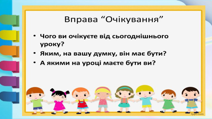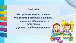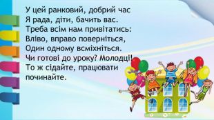 У цей ранковий, добрий час. Я рада, діти, бачить вас. Треба всім нам привітатись: Вліво, вправо поверніться,Один одному всміхніться. Чи готові до уроку? Молодці!То ж сідайте, працювати починайте.