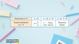 Рівняння вигляду 𝑎𝑥=𝑏, де 𝑥 — змінна, 𝑎 і 𝑏 — числа, називають лінійним рівнянням з однією змінною. Числа 𝑎 і 𝑏 називають коефіцієнтами цього рівняння