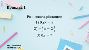 Приклад 1 Розв’язати рівняння: 1) 0,2𝑥=72) −23𝑥=2233) 0𝑥=7