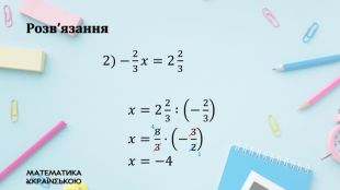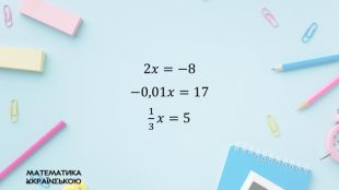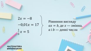 2𝑥=−8 −0,01𝑥=17 13𝑥=5 Рівняння вигляду 𝑎𝑥=𝑏, де 𝑥 — змінна, 𝑎 і 𝑏 — деякі числа