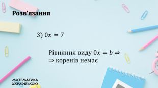 Розв’язання3) 0𝑥=7 Рівняння виду 0𝑥=𝑏 ⇒ ⇒ коренів немає