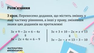 Розв’язання3 крок. Перенесемо доданки, що містять змінну, у ліву частину рівняння, а інші у праву, змінивши знаки цих доданків на протилежні{5940675 A-B579-460 E-94 D1-54222 C63 F5 DA}3𝑥+9−2𝑥=6−4𝑥 ⇓ 3𝑥−2𝑥+4𝑥=6−9 3𝑥+3+10−2𝑥=𝑥+13 ⇓3𝑥−2𝑥−𝑥=13−3−10 {5940675 A-B579-460 E-94 D1-54222 C63 F5 DA}