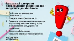 Позбутися від знаменників (якщо вони є)Розкрити дужки (якщо вони є)Перенести доданки, що містять змінну, у ліву частину рівняння, а інші у праву, змінивши знаки цих доданків на протилежніЗвести подібні доданки. Розв’язати отримане лінійне рівняння. Загальний алгоритм розв’язування рівняння, що зводиться до лінійного