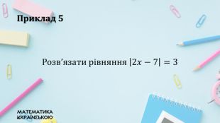 Розв’язання{5940675 A-B579-460 E-94 D1-54222 C63 F5 DA}2𝑥−7=3 2𝑥=10 𝑥=5 2𝑥−7=−3 2𝑥=−3+7 2𝑥=4 𝑥=2 {5940675 A-B579-460 E-94 D1-54222 C63 F5 DA}Щоб модуль деякого виразу дорівнював числу 3, значення цього виразу має дорівнювати 3 або −3. Маємо:2𝑥−7=3