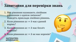 Запитання для перевірки знань. Яке рівняння називають лінійним рівнянням з однією змінною? Наведіть приклади лінійних рівнянь. Коли рівняння 𝑎𝑥=𝑏 має єдиний корінь? Коли рівняння 𝑎𝑥=𝑏 має безліч коренів? Коли рівняння 𝑎𝑥=𝑏 не має коренів?