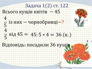 Всього кущів квітів −45 Задача 1(2) ст.122 45 із них−чорнобривці−? 45 від 45= 45:5∗4= 36 (к.) Відповідь:посадили 36 кущів