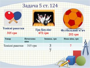 Задача 5 ст.124 Тенісні ракетки. Гра Боулінг. Футбольний м’яч315 грн252 грн672 грн{5 C22544 A-7 EE6-4342-B048-85 BDC9 FD1 C3 A}Товар. Початкова ціна. Знижка, грн. Нова ціна, грн. Тенісні ракетки315 грн37 ?