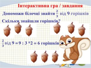 Інтерактивна гра / завдання. Допоможи білочці знайти 𝟐𝟑 від 𝟗 горішків Скільки знайшли горішків?𝟐𝟑від 9 = 9 : 3 *2 = 6 горішків