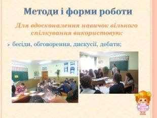 Методи і форми роботи бесіди, обговорення, дискусії, дебати;Для вдосконалення навичок вільного спілкування використовую: