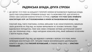 Радянська влада: друга спроба. До квітня 1919 року на більшості території України встановилася радянська влада. Цього разу більшовики отримали більше часу та можливостей, щоб втілити в Україні своє бачення комуністичного устрою. У березні 1919 року було прийнято Конституцію УСРР. За її положеннями в Україні встановлювалася влада рад. Робочий люд, тобто робітники, селяни, військові та всі неексплуататори, вибирали своїх делегатів на З'їзд рад. На ньому вирішували усі основні питання. З'їзди відбувалися періодично, тому між ними справами керував Центральний комітет (ЦК). Він призначав уряд — Раду народних комісарів (РНК), який займався втіленням у життя рішень з'їздів.ІІІ Всеукраїнський з'їзд рад, що відбувся у Харкові у березні 1919 року, якраз затвердив Конституцію УСРР. Першим главою Всеукраїнського центрального комітету (ВУЦВК) став Григорій Петровський, а главою уряду (РНК) — Християн Раковський.
