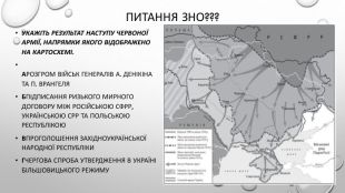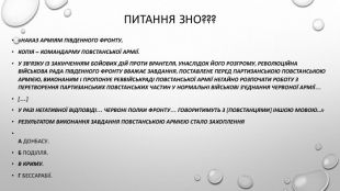 Питання зно???«НАКАЗ АРМІЯМ ПІВДЕННОГО ФРОНТУ,копія – командарму Повстанської армії. У зв’язку із закінченням бойових дій проти Врангеля, унаслідок його розгрому, Революційна військова Рада Південного фронту вважає завдання, поставлене перед партизанською Повстанською армією, виконаним і пропонує Реввійськраді Повстанської армії негайно розпочати роботу з перетворення партизанських повстанських частин у нормальні військові з’єднання Червоної Армії…[…]У разі негативної відповіді… червоні полки фронту… говоритимуть з [повстанцями] іншою мовою...»Результатом виконання завдання Повстанською армією стало захоплення. А Донбасу. Б Поділля. В Криму. Г Бессарабії.