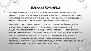 Воєнний комунізм. Оскільки комунізм був ще й військовим, вводили обов'язкову загальну трудову повинність, а економіку значною мірою перебудовували для потреб армії (те що називають мілітаризацією). Змінам підлягала навіть мова, що ви можете помітити з величезної кількості абревіатур та скорочень. Селяни трохи не так уявляли собі «світле комуністичне майбутнє». Масові невдоволення переростають у селянські рухи проти більшовицької влади. Найбільше повстання на півдні України у травні 1919 року очолює отаман Григор'єв. Розпочинаючи з Єлисаветграда, повстанці захоплюють ряд міст центральної та південної України. Проте більшовики придушили повстання. Проти всіх незгодних з політикою «військового комунізму» розпочався «червоний терор». Наступні селянські рухи суттєво підточили сили більшовиків перед початком майбутньої катастрофи.